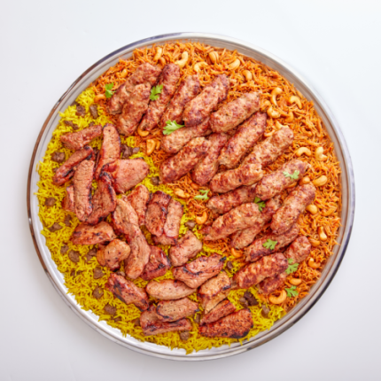 نص كيلو كفتة – نص فرخة مشوية  او شيش +2 رغيف حواوشي – 6قطع سمبوسة +محشي مشكل +كيلو ارز بسمتي