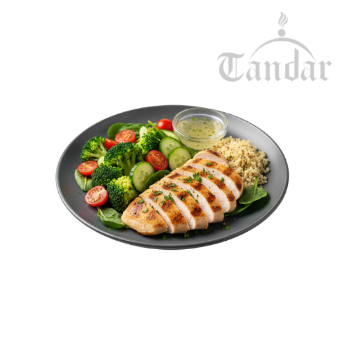 بطاطس مقلية – خضروات طازجه – فلفل الوان – صوص جبنة – صوص مشروم – قطع فراخ مشويه ومتبلة