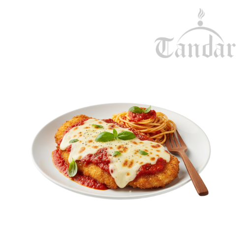 2 قطع دجاج فيليه مغطي بجبنه بارميزون – جبنة موتزاريلا – صوص طماطم – مكرونة حسب اخيارك أو خضار سوتيه او بطاطس بالجبن